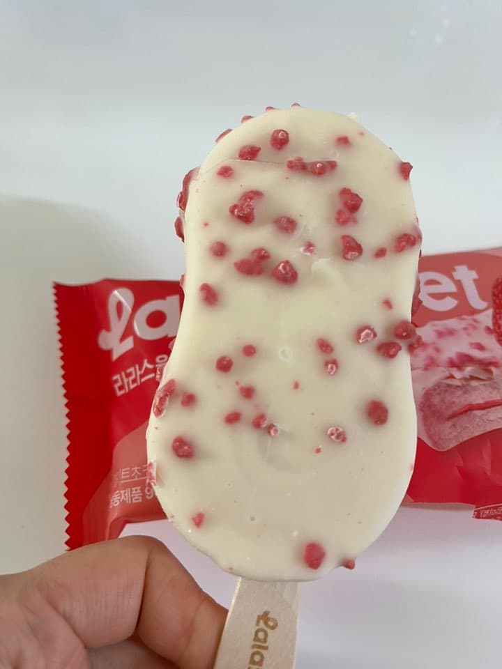 일단 아이스크림을 코팅하고 있는 화이트 초코가 달아요. 기존 라라스윗 초코바의 초코보다 훨씬 답니다. 하지만 안에 들어있는 아이스크림이 깔끔한 맛이 지배적이라 다 먹었을 때 깔끔하다고 느꼈습니다. 진한 맛의 아이스크림을 원하시면 기존 초코바 아이스크림이 더 좋을 듯 합니다. 저는 가끔 당 땡길 때 간식으로 먹으면 좋을 것 같다고 생각했습니다. 후식으로 먹기게는 제가 이 아이스크림과 같이 구매했던 딸기 요거트 아이스크림이 더 좋을 것 같다는 생각이 들었습니다.