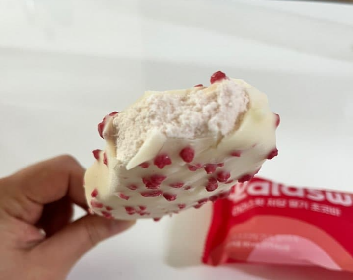 아이스크림을 꺼내봤습니다. 화이트초코에 딸기 분태가 박혀있습니다.
