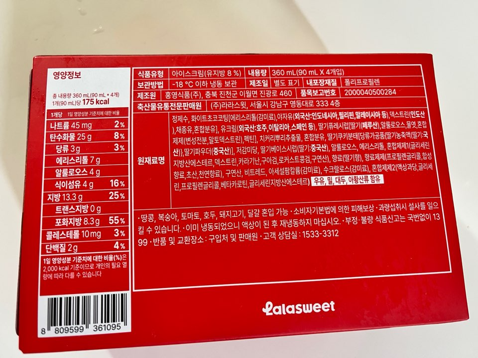 아이스크림은 한 상자에 4개 들어있고 1개당 175kcal 입니다. 당류는 3%으로 무당은 아니지만 적은 편 입니다. 원재료명에 보시면 알겠지만 당을 낮추기 위해 에리스리톨, 알룰로오스, 수크랄로스 등의 감미료가 사용됐습니다.